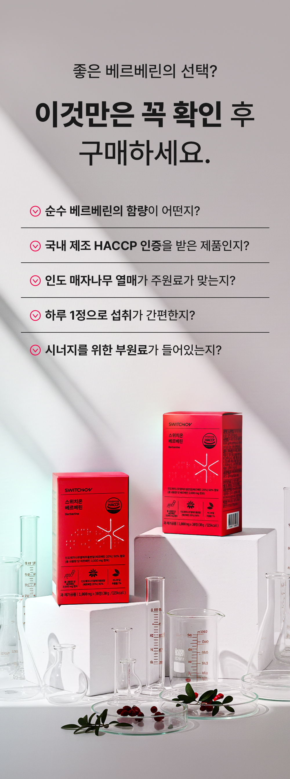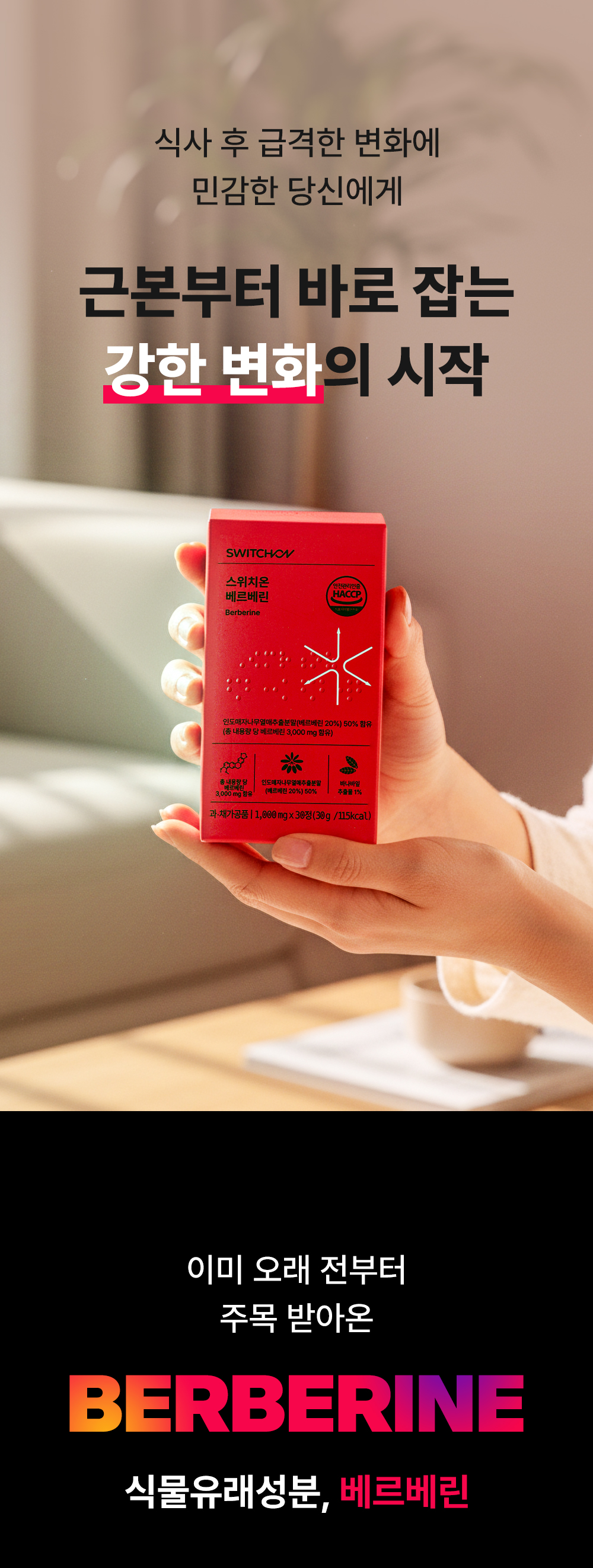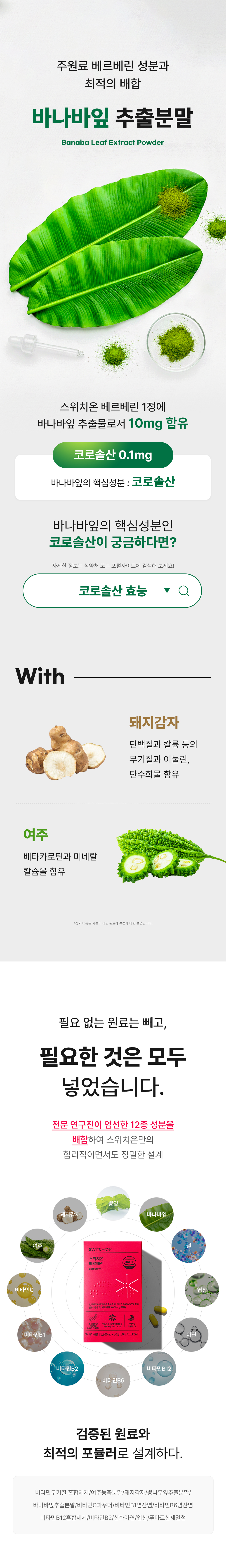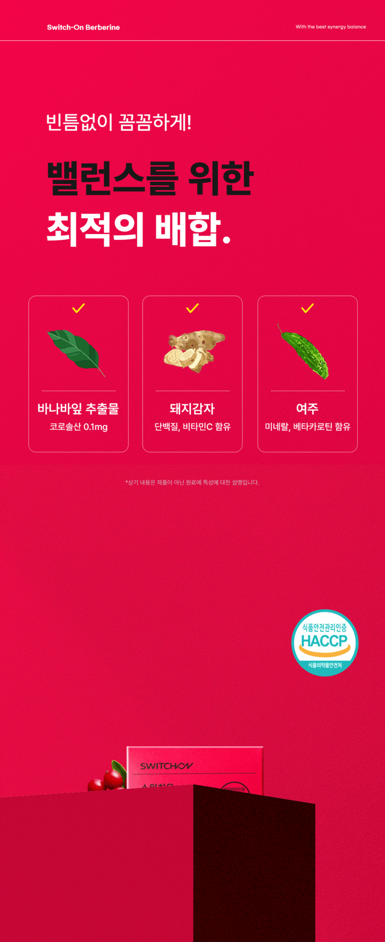 순수 베르베린 100mg과 바나바잎·돼지감자·여주를 균형 있게 배합하고, 불필요한 원료는 빼고, 필요한 것은 모두 넣은 스위치온 베르베린