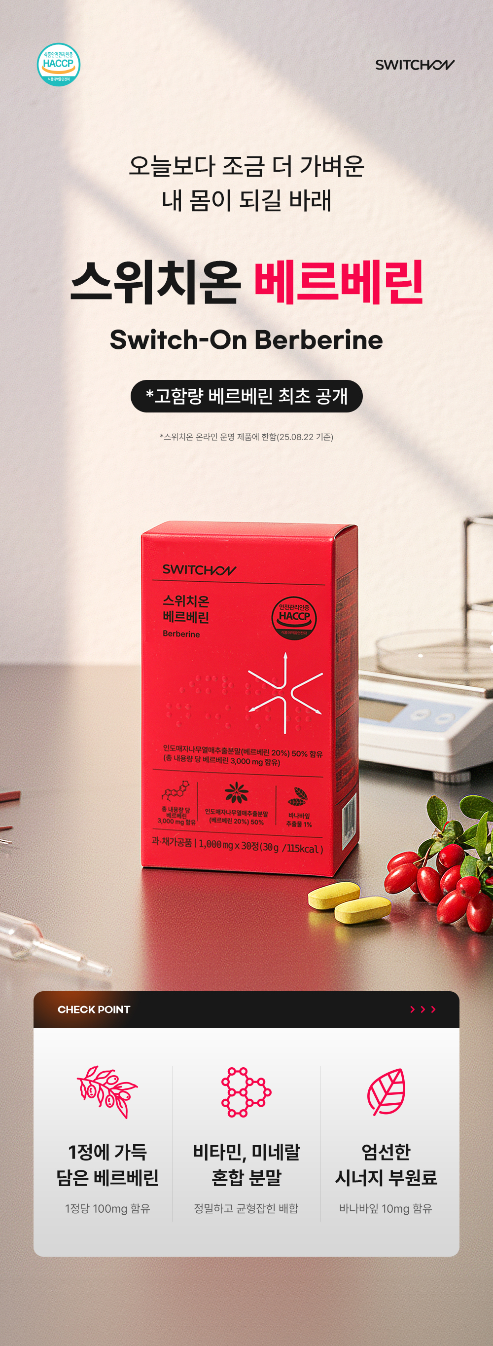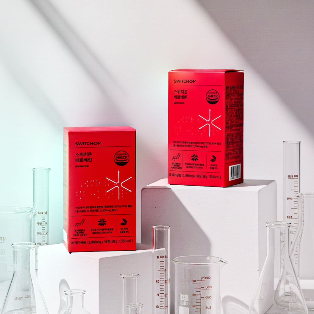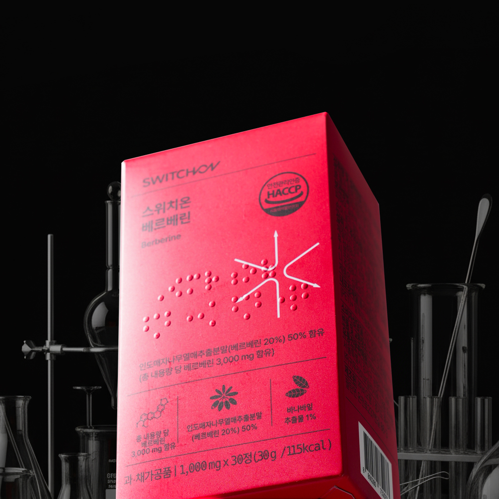 순수 베르베린 100mg과 바나바잎·돼지감자·여주를 균형 있게 배합하고, 불필요한 원료는 빼고, 필요한 것은 모두 넣은 스위치온 베르베린